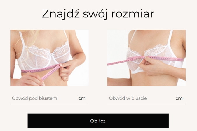 Zaprojektowaliśmy wygodny kalkulator, który pomoże z doborem rozmiaru. Wystarczy wprowadzić do niego swoje wymiary, a on przeanalizuje i zaproponuje kilka opcji. Kalkulator podaje uśrednione wartości, nie znając takich zmiennych jak jędrność czy rozstaw piersi, dlatego warto brać poprawkę na jego sugestie i zawsze mieć "z tyłu głowy" jaki rozmiar nosiło się dotychczas lub w innych markach ;)